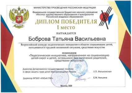 В ноябре 2020 года завершился Всероссийский конкурс педагогических инициатив в области социализации детей, находящихся в трудной жизненной ситуации, средствами искусства. Мероприятие проводилось Департаментом государственной политики в сфере защиты прав детей Минпросвещения России с целью привлечения общественного внимания к проблемам детей, находящихся в трудной жизненной ситуации, а так же выявления и распространения лучших педагогических инициатив, направленных на их социализацию средствами искусства.